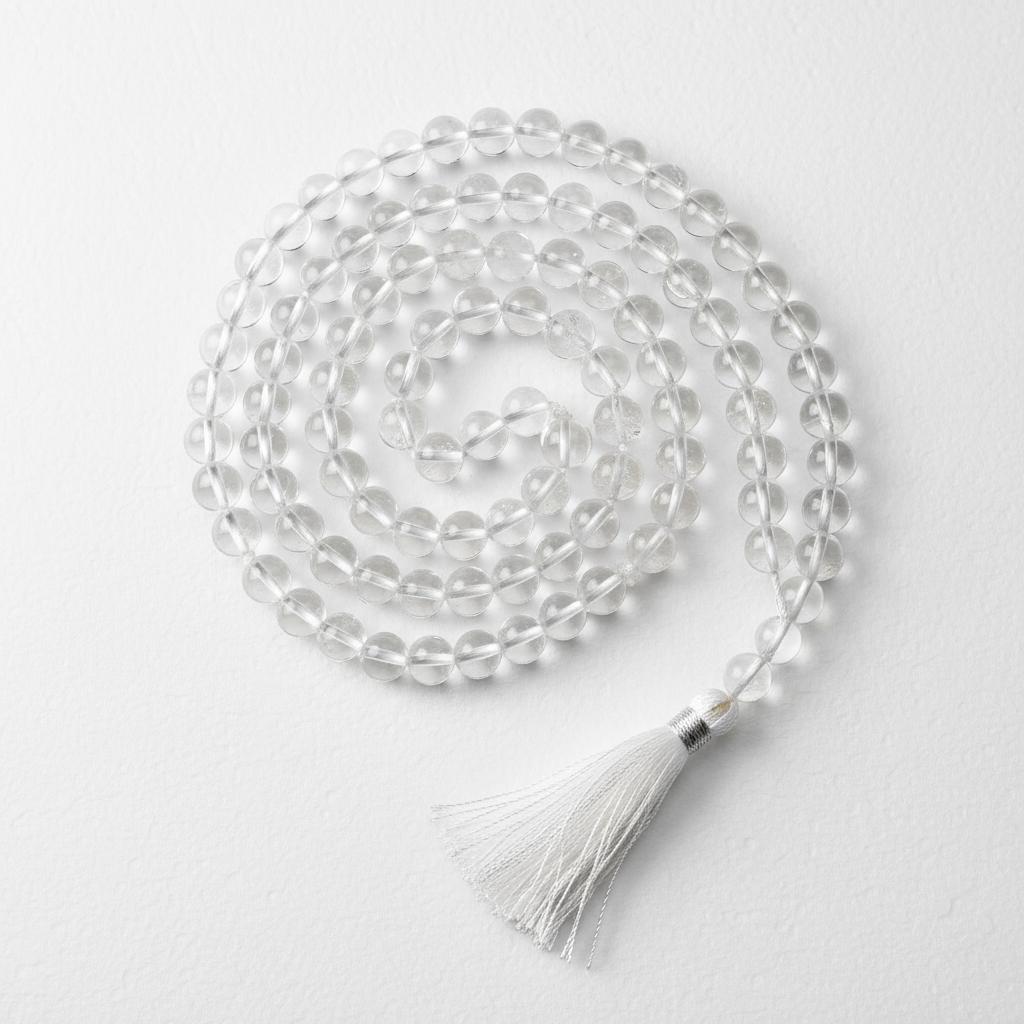A clear crystal mala that calms the mind, purifies energy, and deepens meditation.